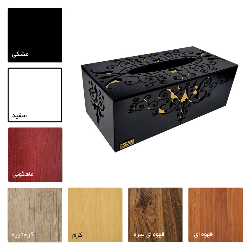 نگهدارنده دستمال کاغذی رانزو گالری کد 002 با طراحي خاص و اختصاصي خود از محصولات پر طرفدار مجموعه رانزو بوده و همانند ديگر محصولات ما ويژگي هايي دارد که اين محصول را از ساير محصولات بازار متمايز ميکند.از جمله ويژگي های مهم آن همانطور که در تصاویر مشخص شده ميتوان به ساخت شدن قسمتهای مختلف این محصول بصورت دولایه برای استحکام و ماندگاری بیشتر اشاره کرد.وجود لوگو اختصاصي رانزو گالري روي محصول و درب کشویی زیر آن برای قرار دادن و جابجایی راحت دستمال و وجود قسمت های طلایی رنگ روی کار که جلوه بصری خاصی به این محصول میدهد از ديگر ويژگي هاي آن است.