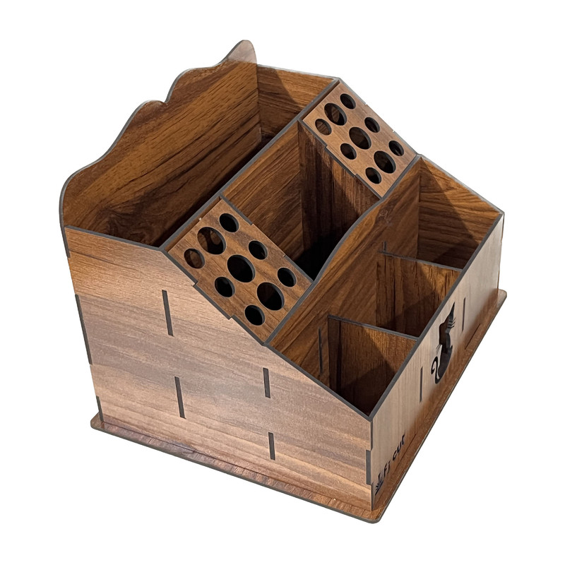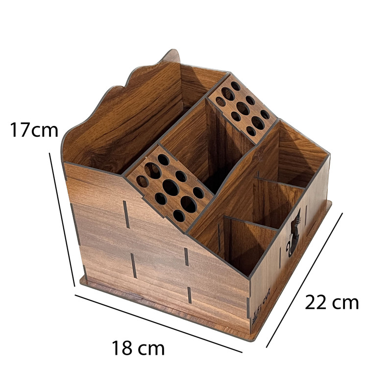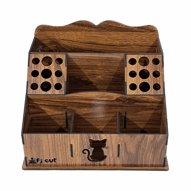 استند لوازم آرایشی اف جی کات دارای ابعاد 22x18x17سانتی متر می باشد که ساخته شده از ورق چوبی ام دی اف سه میل طرح چوب می باشد . در وسط این استند لوازم آرایشی یک عدد طرح گربه لیزر شده است که این محصول را برای علاقه مندان به گربه و حیوانات مورد پسند کرده است . در دو طرف این استند لوازم آرایشی سوراخ هایی طراحی شده است که شما به راحتی می توانید قلم های آرایش خود را داخل آن قرار بدهید و تعداد کل این سوراخ ها 18 عدد می باشد . در انتهای این محصول محفظه ای طراحی شده است که شما میتوانید وسایل بزرگتر خود مانند ادکلن و سایر وسایل خود را به راحتی داخل ن قرار بدهید.