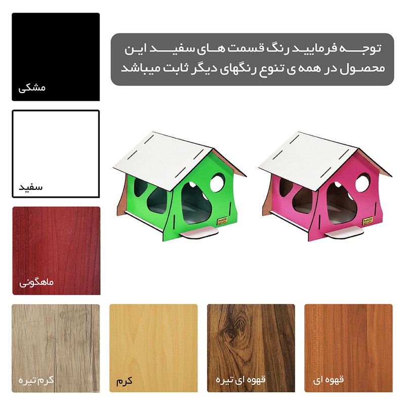 این لانه از چوب ام دی اف ساخته شده و مناسب پرنده هایی با سایز کوچک و متوسط از جمله طوطی برزیلی، قناری، مرغ عشق، فنچ، و ...میباشد.
