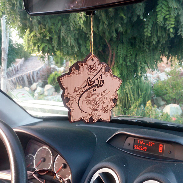 معمولا استفاده از آویز آینه در انواع خودرو مرسوم بوده و تقریبا نمیتوان خودرویی را بدون آویز آینه پیدا کرد. آویز موجود از جنس MDF سه لایه و به صورت دو طرفه طراحی و ساخته شده است. هر دو طرف آویز، آیه مبارکه و ان یکاد حکاکی شده است. اندازه آویز طوری طراحی شده که برای تمام خودرو مناسب می باشد.
