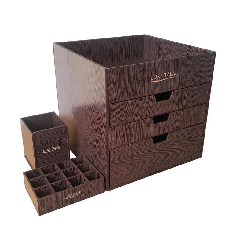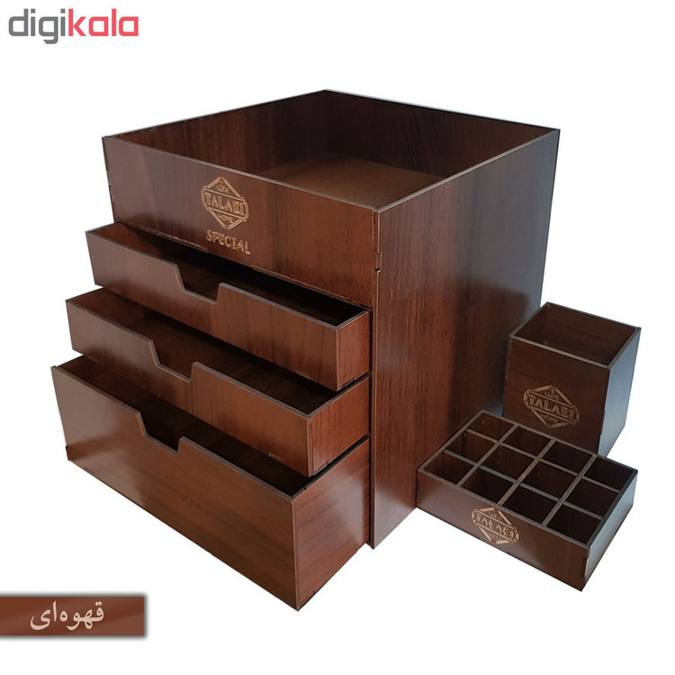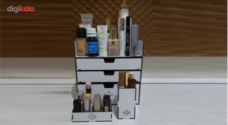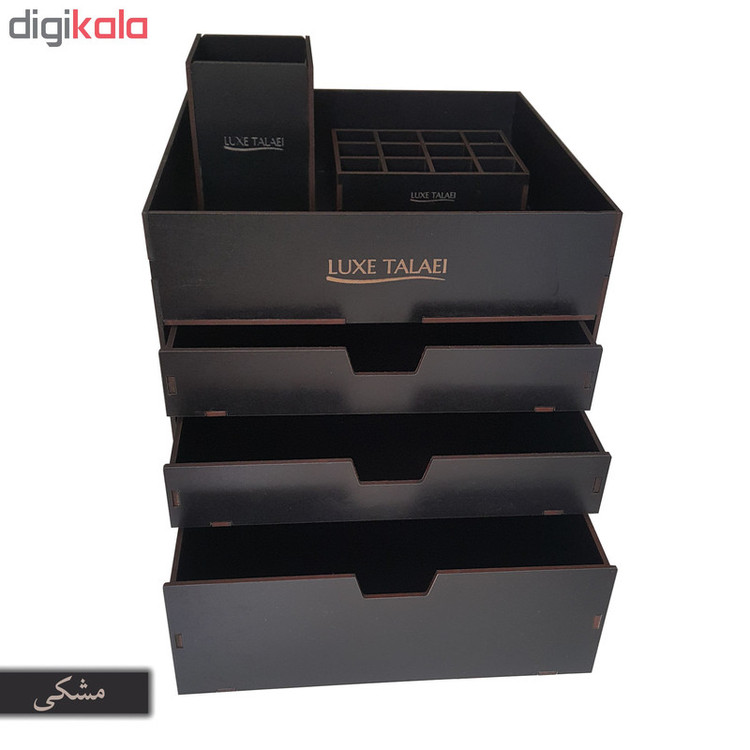 بیشتر خانم ها هنگام آرایش کردن با مشکل نامرتب بودن لوازم آرایشی خود مواجهند که باعث اتلاف وقت و صلب آرامش آنها می شود. لوکس طلائی با طراحی و ساخت انواع نظم دهنده ی لوازم آرایشی سعی در برطرف نمودن این مشکل و القای آرامش به بانوان محترم داشته است. این ارگانیزر از ویژگی های زیر برخوردار است: دارای دو کشو به ابعاد 22 در 22 در ارتفاع های 4 و 8 سانتی متری فضای خالی در بالای کشوها برای لوازم با ارتفاع بیشتر باز و بسته شدن روان کشوها قابل استفاده برای: انواع رژهای لب رژ گونه انواع پنکیک پاک کننده های آرایش انواع سایه های چشم انواع کرم ها در سایز های متفاوت زیورآلات و بدلیجات انواع براش رژ گونه قابل استفاده در داروخانه ها ، فروشگاه های لوازم آرایشی ، آرایشگاه های زنانه و همچنین منزل نظم دادن به لوازم آرایشی به همراه جای براش و استند 12عددی رژ لب