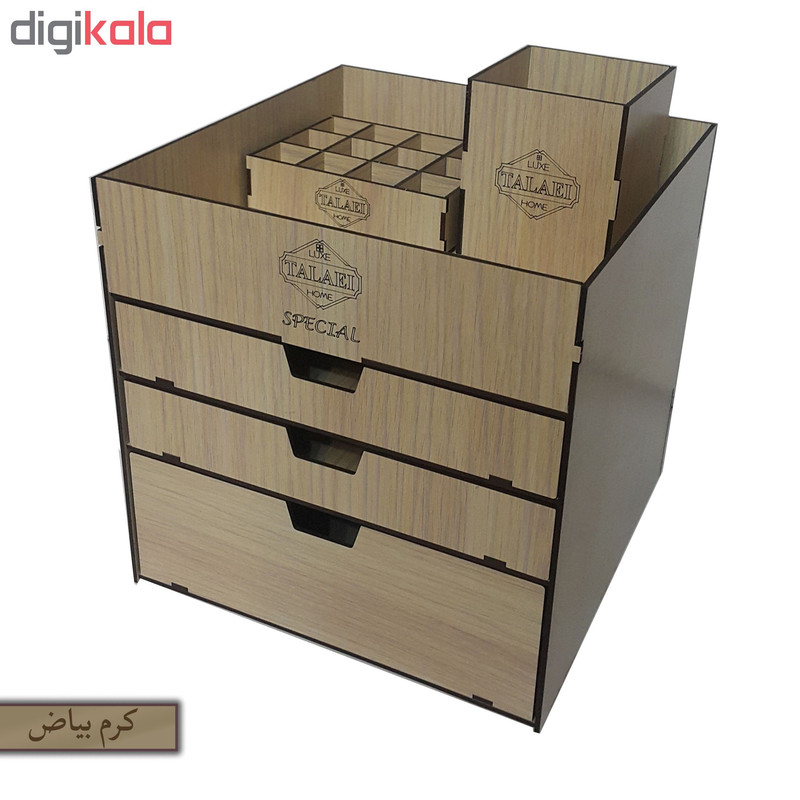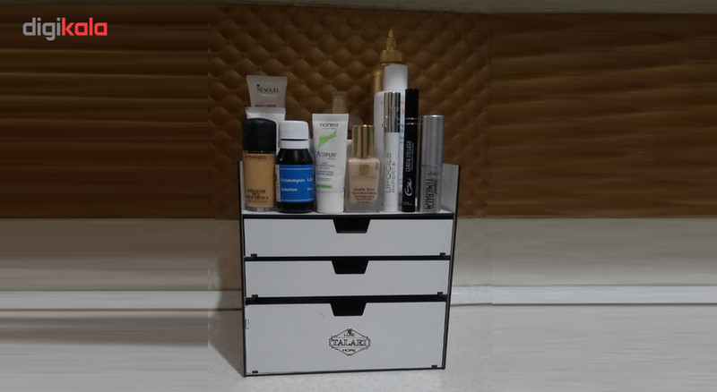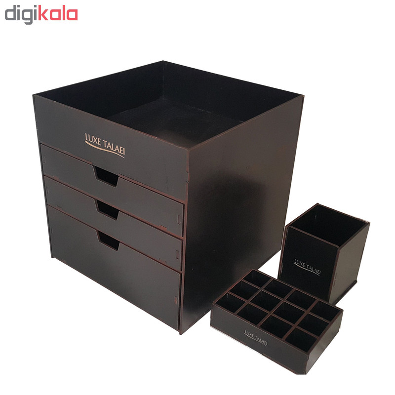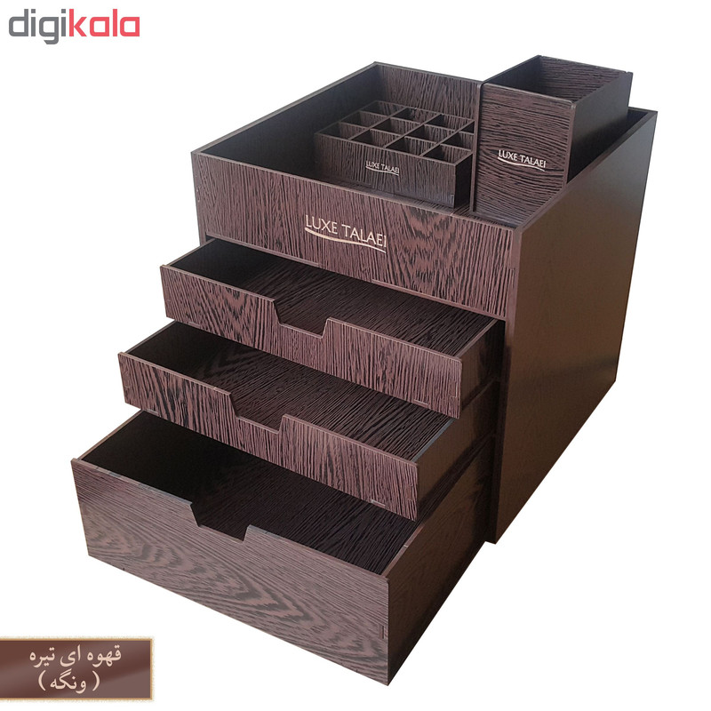 بیشتر خانم ها هنگام آرایش کردن با مشکل نامرتب بودن لوازم آرایشی خود مواجهند که باعث اتلاف وقت و صلب آرامش آنها می شود. لوکس طلائی با طراحی و ساخت انواع نظم دهنده ی لوازم آرایشی سعی در برطرف نمودن این مشکل و القای آرامش به بانوان محترم داشته است. این ارگانیزر از ویژگی های زیر برخوردار است: دارای دو کشو به ابعاد 22 در 22 در ارتفاع های 4 و 8 سانتی متری فضای خالی در بالای کشوها برای لوازم با ارتفاع بیشتر باز و بسته شدن روان کشوها قابل استفاده برای: انواع رژهای لب رژ گونه انواع پنکیک پاک کننده های آرایش انواع سایه های چشم انواع کرم ها در سایز های متفاوت زیورآلات و بدلیجات انواع براش رژ گونه قابل استفاده در داروخانه ها ، فروشگاه های لوازم آرایشی ، آرایشگاه های زنانه و همچنین منزل نظم دادن به لوازم آرایشی به همراه جای براش و استند 12عددی رژ لب