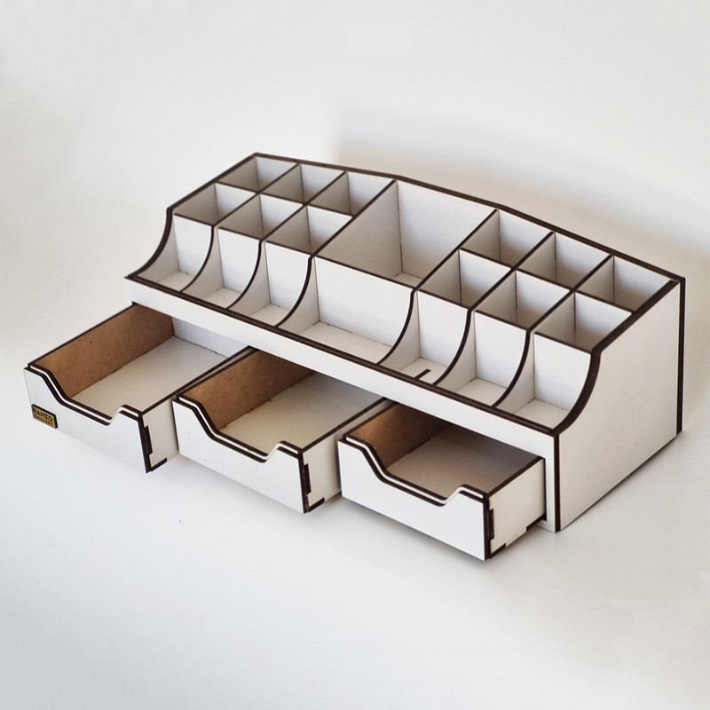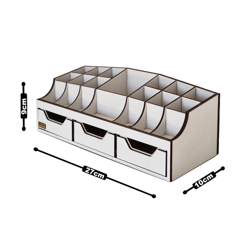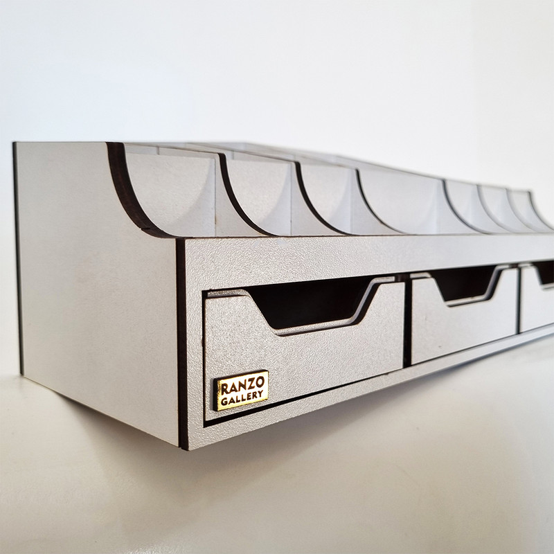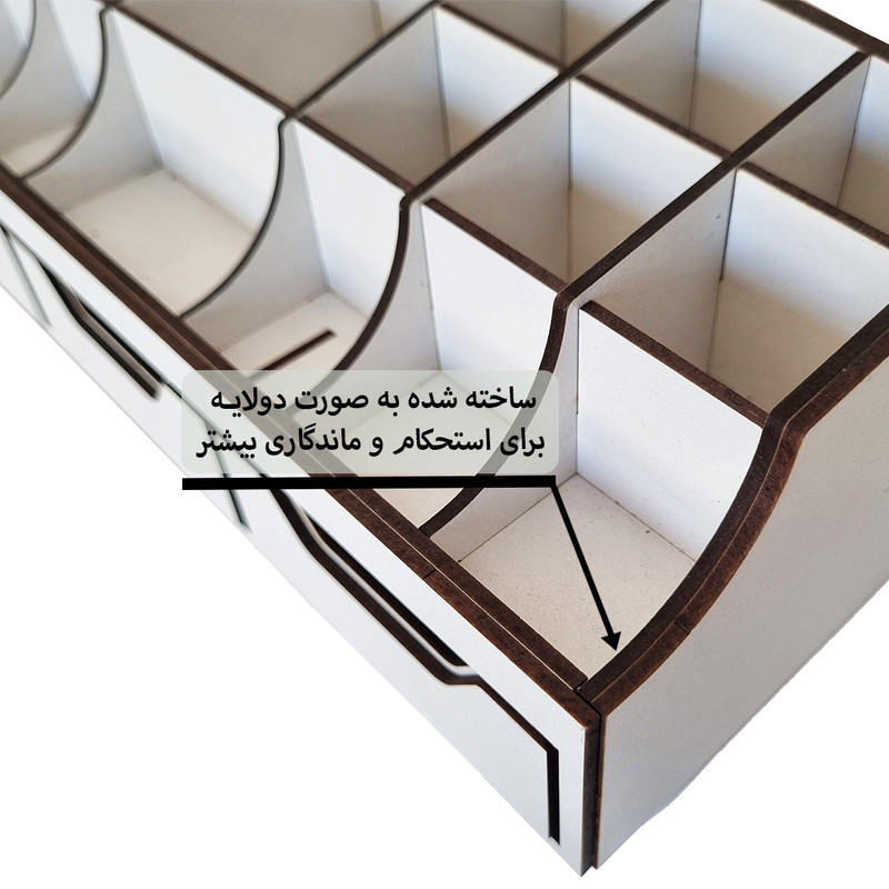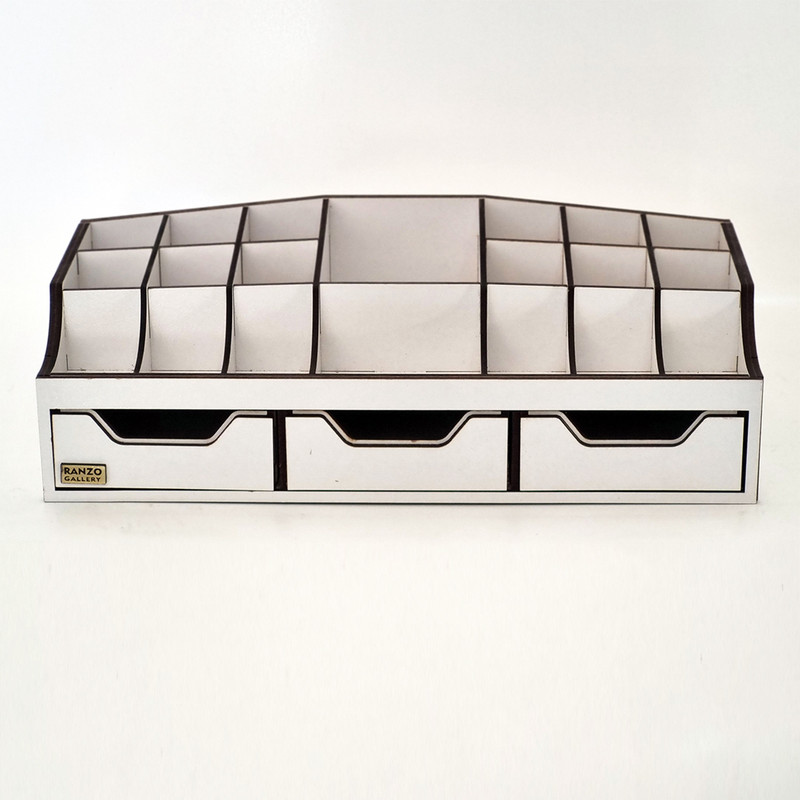 این محصول در مجموعه رانزو گالری طراحی و تولید شده و با چوب مرغوب و روکش دار در رنگهاي مختلف ساخته شده است و مانند ديگر محصولات ما ويژگي هايي دارد که اين محصول را از ساير محصولات بازار متمايز ميکند.از جمله ويژگي هاي مهم آن همانطور که در تصاوير مشخص شده ميتوان به ساخت شدن قسمتهاي مختلف اين محصول بصورت دولايه براي استحکام و ماندگاري بيشتر اشاره کرد. ضخامت مناسب، استحکام بالا، وزن کم، طبقات جادار، اشغال فضای کم و وجود لوگو اختصاصي رانزو گالري روي محصول از ديگر ويژگي هاي آن است.از این محصول میتوان در فضاهای مختلفی همچون روی میز جهت نظم دادن به وسایل آرایشی، لوازم تحریر، لوازم خیاطی، لوازم اداری و ... استفاده کرد.